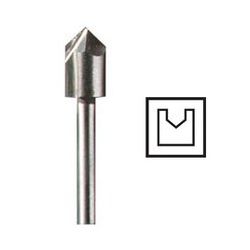 Fresa de ranurar en V. Para palabras de letreros y rotulaciones. Diámetro del vástago 3,2 mm Diámetro de trabajo 6,4 mm Utilización Ranura en V Máximas rpm 35.000 rpm