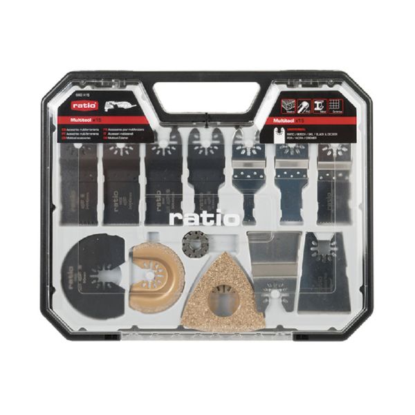 Anclaje universal. Juego 15 accesorios. Hojas de sierra oscilantes: 1 HCS 34x40 mm. Madera 2 HCS 34x40 mm. Madera/PVC 1 BIM 34x40 mm. Madera/PVC/Metal 1BIM 28,5x40 mm. Madera/PVC/Metal 1 INOX 10x40 mm. Madera/PVC 1 INOX 20x40 mm. Madera/PVC 1 INOX 31x40 mm. Madera/PVC 1 HSS ø 80 mm. Madera/PVC/Metal. 1 Hoja rascador recta. INOX 50x30 mm. 1 Hoja rascador acodada INOX 50x30 mm. 1 Hoja de sierra metal duro semi circular. ø 66 mm. (para quitar juntas delgadas en azulejos). 1 Hoja lijadora y de limpieza. Metal duro. 78x78x78 mm. (para levantar el mortero o la cola de los azulejos). 2 Adaptadores de 25 mm.
