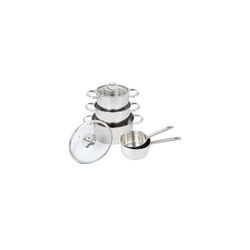 5 piezas. Acero inoxidable. Fondo capsulado de aluminio 4,5 mm. Mangos de baquelita. Tapa cristal transparente con válvula de vapor. Para todo tipo de cocinas. Cazo ø 14 cm. Cazo ø 16 cm. Cacerola ø 18 cm. c/tapa Cacerola ø 20 cm. c/tapa Cacerola ø 24 cm. c/tapa