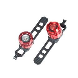 Kit 2 unidades. Luz LED blanca/roja de alta luminosidad. 2 funciones: luz fija, flash intermitente. Pilas CR2032 (incluidas). Abrazadera de goma ajustable.