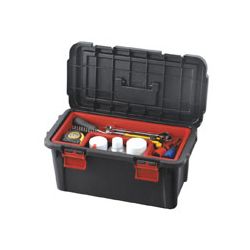 Estructura polipropileno reforzado. Cierres ABS de gram resistencia. Bandeja interior con hueco para colocar verticalmente botes de spray o tubos. Cajas apilables entre sí. Color negro/rojo acabado mate. Fabricadas en Japón. 56x29x29 cm.