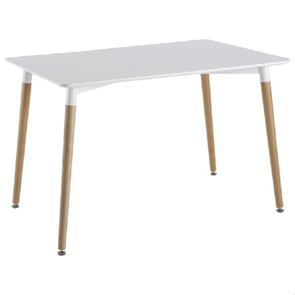 Patas de madera de haya barnizada. Tableros MDF lacado blanco. Sillas asiento polipropileno. Mesa 115x75xh.75cm