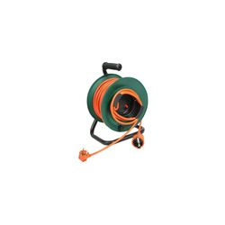 Clavija Schuko TT lateral. Cable 3G1,5 mm. Potencia máx. 3600 W. Tambor 25 m.