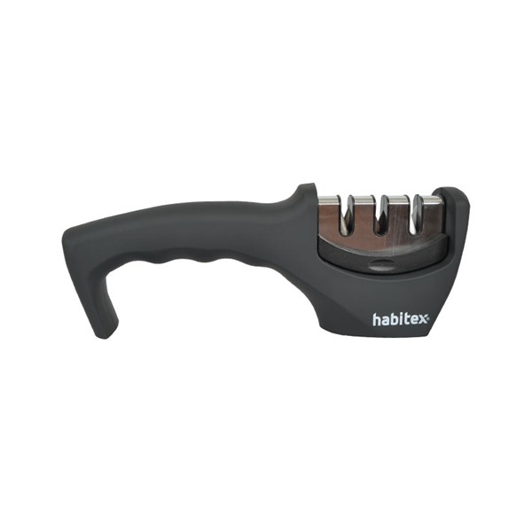 3 fases de afilado: diamante (preparación del afilado); carburo de tugsteno (afilado grueso). y cerámica (afilado fino). Base antideslizante. Empuñadura soft-touch. Color negro. 20,5x7 cm.