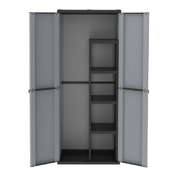 Materiales resistentes a la intemperie. Estantes regulables. Color gris/negro. Kit de montaje. Armario escobero 4 estantes. 68x38xh.164 cm.