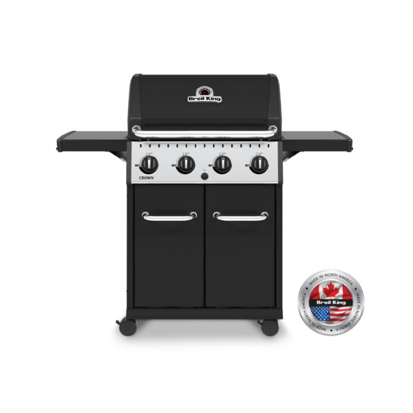 El Broil King® Crown™ 420 cuenta con una superficie de cocción primaria de 2.865 cm2, rejillas de cocción de hierro fundido, rejilla de calentamiento, sistema de cocción de acero inoxidable Flav-R-Wave™, 4 quemadores de tubo de acero inoxidable, estantes laterales de pintura en polvo negra y una base de armario cerrada.
