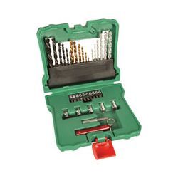 Estuche plástico brocas surtidas, puntas y vasos. Composición: 6 brocas pared: diam 3, 4, 5, 6, 8, 10 mm. 6 brocas HSS: diam 2, 3, 4, 5, 6, 6.5 mm. 6 brocas madera: diam 3, 4, 5, 6, 8, 10 mm. 10 puntas atornillado 25 mm: Phillips, Allen y Torx 5 vasos: 4, 5, 6, 7, 8 mm. 1 adaptador magnético 1 linterna led llavero.