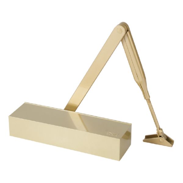 Mecanismo piñon-cremallera con brazo. Fuerza regulable EN 3-4. Anchura puertas hasta 110 cm. Puertas hasta 100 kg. Sin retenedor. Dorado.