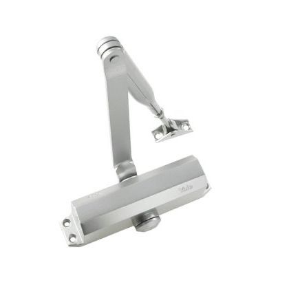 Mecanismo piñon-cremallera. Doble ajuste de velocidad de cierre y de golpe final mediante 2 tornillos sin necesidad de desmontarlo. Fuerza 3. Puertas hasta 60 Kg. Certificado CE para puertas cortafuegos. Con retenedor. Plata.