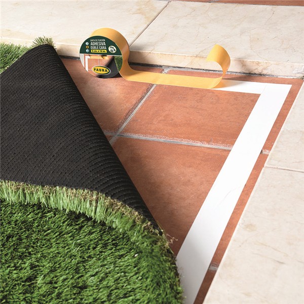 Doble cara. Resistente a la intemperie y a los rayos UV. Tela de algodón y pegamento termofusible. Fuerte adherencia. Fácil corte. Aplicación: Fijación de césped artificial. Antideslizante e impermeable. Superficie lisa interior y exterior. 5 cm x 10 m.
