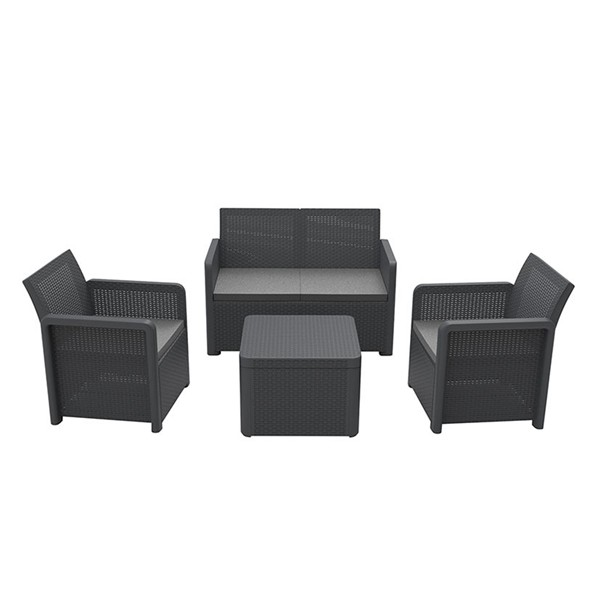 Polipropileno color grafito. Capacidad de almacenaje en la mesa. Cojines en polialgodón color gris oscuro. Sofá 2 plazas: 109x60xh.74 cm. Sillón individual: 59x60xh.74 cm. Mesa centro: 57x57xh.42 cm.
