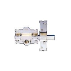 Llave exterior y botón interior. Barra en acero calibrado 18 mm. Placa en acero 2 mm. Cerradero en acero 3 mm. Bombillo 50 mm. Niquelado
