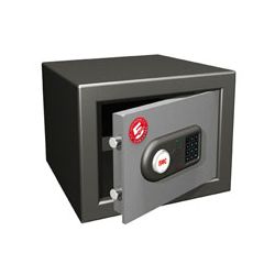 Sobreponer. Cuerpo en chapa de acero de 2 mm. Puerta en chapa de acero de 6 mm. Cierre con dos burlones. Apertura mediante código electrónico y llave. Llaves de emergencia. Exterior: 370x350xh290 mm. Interior: 365x280xh285 mm.