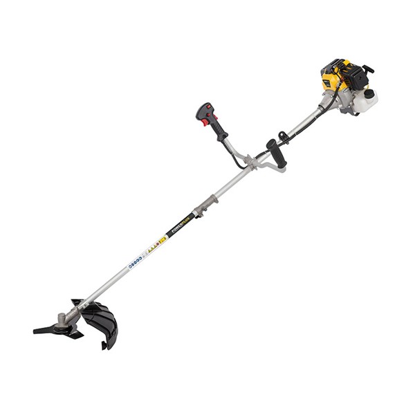 Cabezal de 2 hilos. Cuchilla de tres puntas. Arnés para colgar. Cilindrada: 52 cc. rpm max: 6800. Ancho corte máx.: 420 mm. Largo total: 1.850 mm. Tanque combustible: 1.100 ml. Velocidad cadena: 21,2m/s. Carrete - doble hilo: ø 2,4x4 m. Cuchilla 3 puntas: 255x25,4x1,4 mm. Filos de corte: 3 unid.