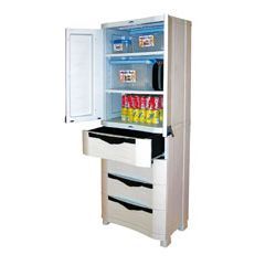 Para exterior, materiales resistentes a la intemperie. Color gris. Kit de montaje. 3. Armario 2 estantes regulables. 70 x 45 x 184 cm. Cajonera desmontable 4 cajones con guías metálicas.