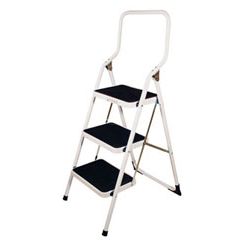 Tubo acero pintado epoxi blanco. Peldaños y pies angulares antideslizantes. Arco sobredimensionado. Bloqueo de seguridad. Escalera tamburete 2 peldaños.