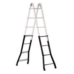 Acero. Multiposiciones telescópica. Sistema cierre rápido. Largo según posiciones: Recta 3,48 m, doble 1,62 m. Acero-aluminio 14 peldaños.