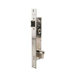 Golpe y llave exterior, (golpe accionado por manilla o llave) reversible. Especial portero automático. Frente inoxidable. Entrada 25 mm.