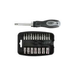 Mango ergonómico bimaterial antideslizante. Carraca reversible. 12 puntas acero S2. 7 vasos1/4 en acero cromo vanadio. 1 adaptador para vasos. Mango destornillador.