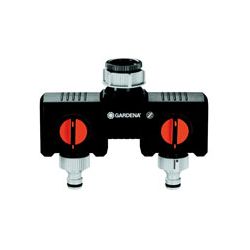 El distribuidor de dos vías GARDENA permite conectar a la vez dos accesorios a un grifo. Las salidas son totalmente regulables. Pueden conectarse dos programadores de riego GARDENA al distribuidor. El distribuidor de 2 vías puede convertirse al Profi-System GARDENA con el macho Profi-System (nº art. 2801-20). El distribuidor de 2 vías GARDENA es apto para grifos con rosca de 26,5 mm (3/4") y (1").