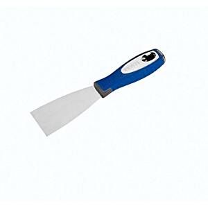 Mango recubierto de elastómero antideslizante Refuerzo metálico para poder golpear Forma ergonómica del mango. Zona rayada para contacto con la mano Cuerpo interno del mango fabricado en plástico de gran resistencia Hoja de Acero inoxidable Agujero en el mango para colgar Hoja rectificada conicamente para flexionar la punta Presentación en pulido espejo