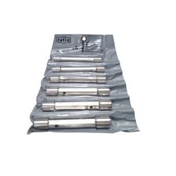 Recta. Acero aleado especial, satinadas. 6 piezas. DIN 896. Cuerpo acero cromo-vanadio satinado. Cuello de llave más ancho, aumenta la tensión de apriete. Cabeza con anillo estrecho y perfil alto, sujección máxima de la tuerca. 6 x 7 - 16 x 17 mm.