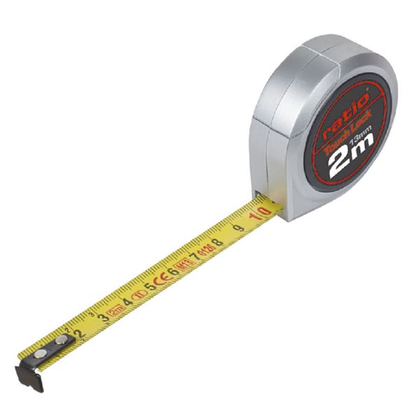 Carcasa ABS. Cinta de acero con revestimiento antireflex. Gancho metálico. Modelo sin botón de freno, se frena ejerciendo presión sobre la parte central de la carcasa (etiqueta). Incluye imán en la parte trasera. Homologado CE. Clase de precisión II. 2 m. Cinta 13 mm.
