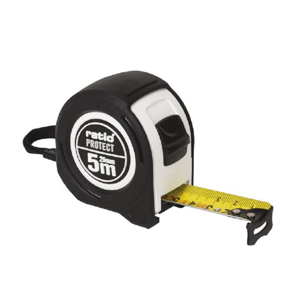 Carcasa ABS con recubrimiento antideslizante. Cinta numeración doble cara (amarilla/blanca) con revestimiento nylon antireflex. Gancho reforzado. Clip para cinturón y botón de bloqueo. Homologado CE. Clase de Precisión II. 5 metros. Cinta 25 mm.