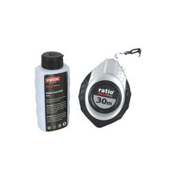 Manivela plegalbe y rebobinado 3 veces más rápido Carcasa ABS con recubrimiento antideslizante Tensión máxima del hilo 15 kg Gancho de acero inoxidable Incluye bote de 200 gr de marcaje azul, especial yeso, hormigón, piedra o madera Plomada cuerda 30 m.