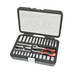 Acero cromo-vanadio satinado. Vasos 1/4 con sistema de bloqueo Locksystem. Composición: 13 Vasos 1/4: 4-14 mm. 13 Vasos serie larga 1/4: 4-14 mm. 1 Llave carraca 45T x 1/4. 2 Prolongadores 1/4 x 50-100 mm. 1 Cardán universal 1/4. 1 Mango destornillador vasos 1/4. 1 Mango deslizante T 1/4 x 110 mm.