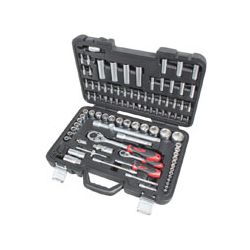 Acero cromo vanadio satinado. Vasos 1/4 y 1/2 con sistema de bloqueo Locksystem. Composición: 18 Vasos 1/2 10-32mm. 13 Vasos 1/4 4-14 mm. 4 Vasos serie larga 1/2 14-15-17-19 mm. 8 Vasos serie larga 1/4 6-13 mm. 22 Vasos 1/4 con punta PH: 2xnº 1-2xnº 2 Plana: 4-5.5-7 mm Allen: 3-4-5-6 mm. PZ: 2xnº 1-2xnº 2 Torx: 8-10-15-20-25-27-30 3 Llaves allen: 1.5-2-2.5mm. 2 Prolongador 1/2 x 125-250 mm. 2 Llaves bujías 1/2 x 16-21 mm. 2 Prolongador 1/4 x 50-100 mm. 1 prolongador flexible 1/4x150 mm. 2 Llave carraca 1/4-1/2 (1/2 68T y 1/4 45T). 2 Cardán universal 1/4-1/2 2 Adaptador puntas 1/4 - 1/2 (para 8 mm). 1 Cabezal mango T 1/2 h x 3/8 m. 1 Mango deslizante T 1/4 1 Mango destornillador vasos 1/4 15 puntas atornillado 8x30 mm: PH: 3-4. Plana 8-10-12 mm. Allen: 8-10-12-14mm. PZ:3-4. Torx: 40-45-50-55