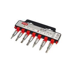 Acero cromo-vanadio, acabado satinado. Dureza puntas 59-61 HRc. 7 vasos 1/4. Plana: 4-5.5-6-7 mm. Phillips: Nº1-Nº2-Nº3