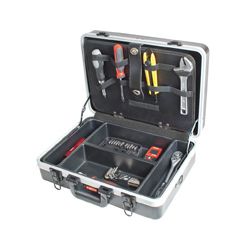 Estructura ABS con perfilería de aluminio. Cierres metálicos con llave. Interior plástico rígido. Empuñaduras antideslizantes. Portaherramientas Rigidbox 6558. 44x15xh.31,3 cm Bandeja interior portaherramientas (doble cara). Interior rígido de 4 compartimentos Correa de transporte.