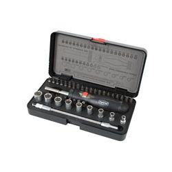 Carraca reversible alto par de apriete. Destornillador con varilla ajustable. Vasos 1/4 acero cromo-vanadio. Puntas atornillado acero cromo-vanadio S2. Composición: 1 mango destornillador extensible 55-127 mm. 1 prolongador flexible 1/4x190 mm. 1 adaptador de vasos 1/4. 9 vasos SuperLock: 5-6-7-8-9-10-11-12-13 mm. 30 puntas: Plana: 3-4-5-6 mm. Phillips: 1-1-2-2-3-3 Pozidriv: 1-1-2-2-3-3 Torx: T9-10-15-20-25-27-30-40 Allen: 2-2,5-3-4-5-6 mm.