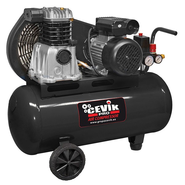 Motor monofásico. Cilindros de hierro fundido y protectores de correa de acero. Potencia: 230 V. Depósito: 100 litros. 1.420 rpm. Caudal aire: 320 l/min. Peso: 51 kg.