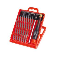 32 piezas. Acero cromo-molibdeno. Estuche plástico. 1 Mango ergónomico bimaterial antideslizante, cabezal giratorio 1 Prolongador 9 Puntas Torx: T4-T5-T6-T7-T8-T9-T10-T15-T20 7 Puntas Planas: 1,0-1,5-2,0-2,5-3,0-3,5-4,0 mm. 4 Puntas Phillips: Nº000-Nº00-Nº0-Nº1 2 Puntas Pozidriv: Nº0-Nº1 8 Puntas Allen: 0,7-0,9-1,3-1,5-2,0-2,5-3,0-4,0 mm.