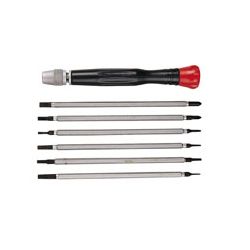 12 en 1. Acero cromo-vanadio. Estuch plástico. 1 Mango destornillador 6 Varillas doble boca: Plana 2 mm. x Phillips º 00 Plana 3 mm. x Phillips Nº 0 Plana 4 mm. x Phillips Nº 1 Torx T5 x T20 Torx T6 x T15 Torx T8 x T10