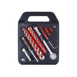 Acero cromo-vanadio. 47 piezas. Acabado satinado. 9 Vasos 3/8: 10 - 19 mm 11 Vasos 1/4: 4 - 13 mm 1 Adaptador 3 Llaves Allen : 1,5 - 2 - 2,5 1 Llave carraca reversible 1 Prolongador 1 Mango para vasos 1 Adaptador de puntas 19 Puntas hexagonales