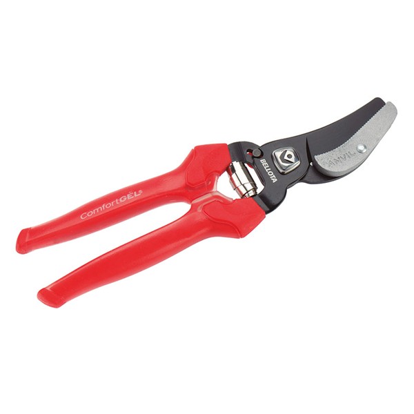Tijera de jardín de una mano. Corte yunque curvado con hoja de acero templado y recubierto para un corte suave. Mangos de polipropileno. Polipropileno.