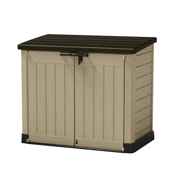 Para interior o exterior. Polipropileno inyectado gran resistencia. Hasta 1.200 litros. Dispone rejilla ventilación. Incluye suelo. Dispone pistones metálicos para abrir y cerrar fácilmente. Posibilidad cierre con candado. Color beige. 146x82xh.120 cm.