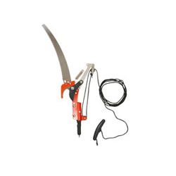 Cuchilla teflonada de acero con tratamiento térmico. Longitud cuerda 3 m. Sistema desmultiplicación de fuerza. Serrucho diente universal 30 cm. Conexión a mangos intercambiables de aluminio. Tijera Ø corte 20 mm.
