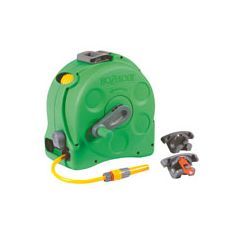 Tecnología de rebobinado en capas. Carrete para colocar en suelo o montar en la pared. Incluye guía mural manguera, conectores y boquilla. 25 m. manguera diam 11 mm.