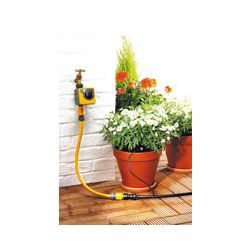 Kit de riego automático para regar un seto de hasta 10 m. Longitud, 20 plantas en macetas o un parterre de 5x2 m. Sistema electrónico AC1+ de computación de riego. Reductor de presión, tubería 13 mm x 15 m, microtubería 4 mm x 10 m, 5 grapas 13 mm para pared, 5 grapas 4 mm para pared, 10 piquetas de 4 mm, 20 goteadores compensación presión y conectores. -