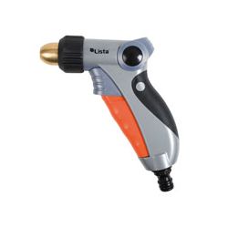 Cuerpo metálico de gran resistencia. Riego regulable desde chorro a lluvia fina. Regulador salida caudal de agua. Gatillo con sistema de bloqueo. -