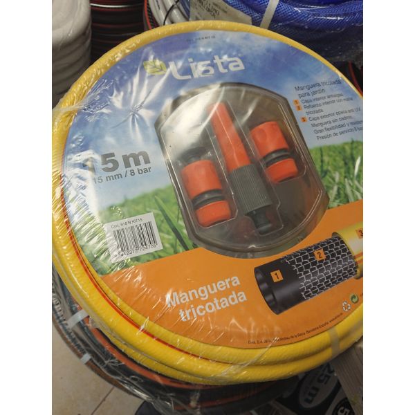 Conjunto conexiones: racor hembra, 2 conectores y lanza riego. Tricotada 3 capas. Atóxica. Antialgas. Presión de servicio 8 bares. Ø 15 mm x 15 m