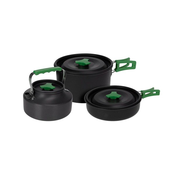 Juego 3 piezas especial camping. Aluminio anodizado con mangos acero inoxidable. Cacerola con tapa 178x90 mm. + Sartén 180x43 mm. + Hervidor con tapa 151x75 mm. Mango plegable color verde. Juego 3 piezas.