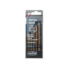 Acero al cobalto (HSSCo) DIN 338RN, geometría corte rectificada. Calidad industrial. Estuche plástico 6 brocas. diam. 2, 3, 4, 5, 6, 8 mm.