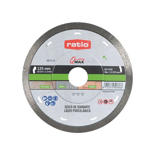 Soldadura láser. Disco perfecto continuo para porcelánico. Corte rápido y limpio. Extrafino con segmento 5 mm. Gran rendimiento. Para: Placas de granito, cerámica y porcelánico. CONFORME A: EN 13236. ø 125x1,3 mm.