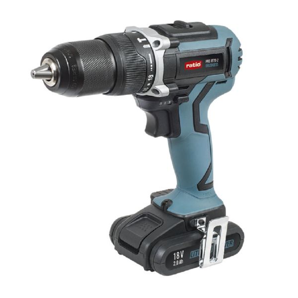 Motor sin escobillas. Reversible. 2 velocidades. Portabrocas métalico automático 13 mm. Empuñadura bimaterial. Cargador rápido 48 min. Clip para cinturón. Maletín de transporte. Potencia: 18 V. rpm: 0-450/0-1.600 ipm: 0-7.200/0-25.600 Batería litio: 2x2 Ah. Par apriete: 40 Nm. Taladro máx. acero: 10 mm. Taladro máx. madera: 35 mm. Taladro máx. hormigón: 13 mm. Peso: 1,35 kg.
