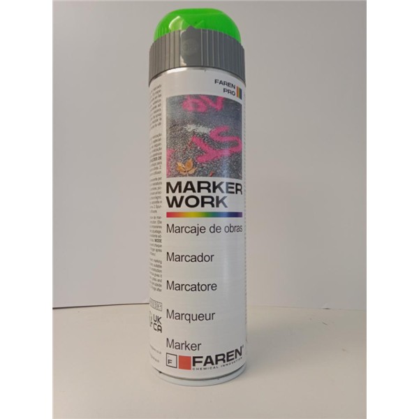 MARKER WORK es una pintura de marcado fluorescente para la industria de la construcción. Es especialmente adecuado para señalizaciones temporales en las siguientes áreas: Señalización de obra, estacas, señalizaciones diversas. Permite marcajes muy visibles gracias a su alta concentración de pigmentos altamente fluorescentes. Su fórmula le confiere una excelente adherencia sobre hormigón, asfalto, grava, césped y madera.